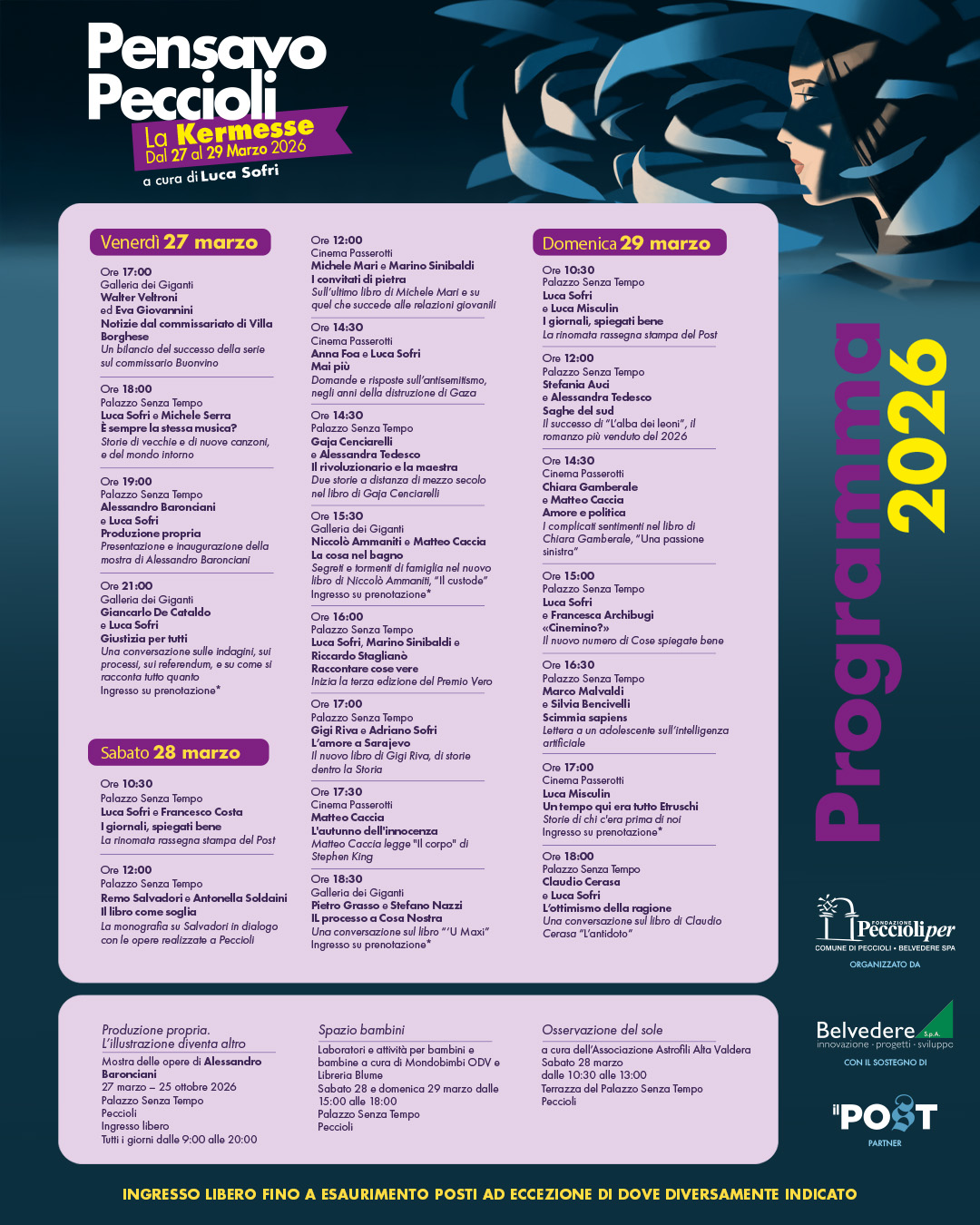 Accanto agli incontri del festival, a Palazzo Senza Tempo viene inaugurata la mostra di Alessandro Baronciani, illustratore e fumettista, artista eclettico e musicista, autore dei manifesti delle edizioni di Le Canzoni, l’appuntamento estivo del Post dedicato alla musica e ospitato all’interno del festival 11Lune a Peccioli. La mostra, dal titolo Produzione propria, è visitabile dal 27 marzo al 25 ottobre 2026, e raccoglierà la produzione passata e recente dell’autore in un percorso che intreccia invenzioni su carta e visive, installazioni e una “camera” speciale dove sedersi e guardare il mare e i manifesti dei concerti.